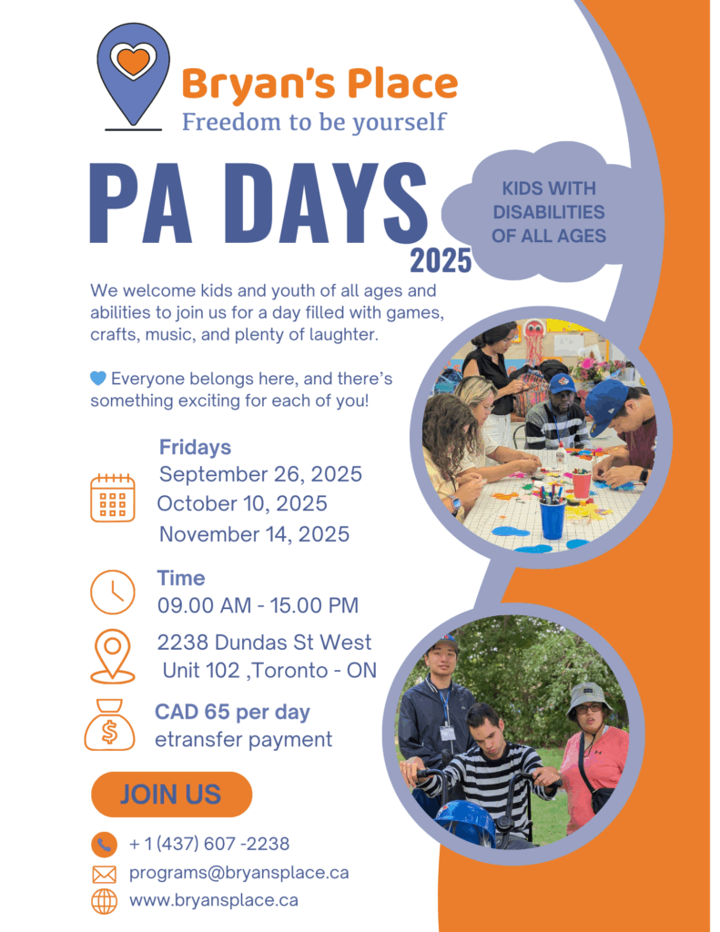 We are excited to invite kids and youth of all ages and abilities to our PA Day at Bryan’s Place! It will be a fun-filled day packed with games, crafts, music, and plenty of laughter. Everyone belongs here, and we have something exciting planned for each participant!