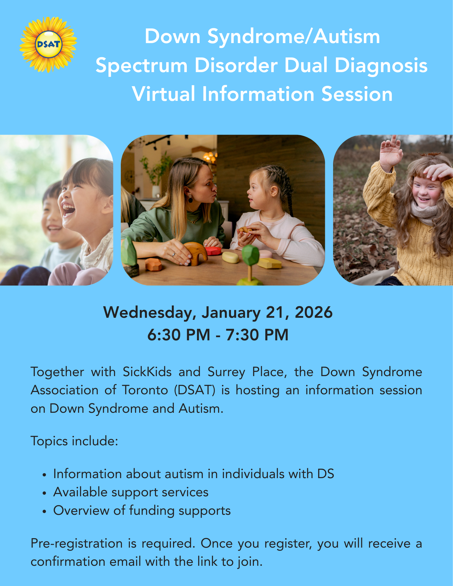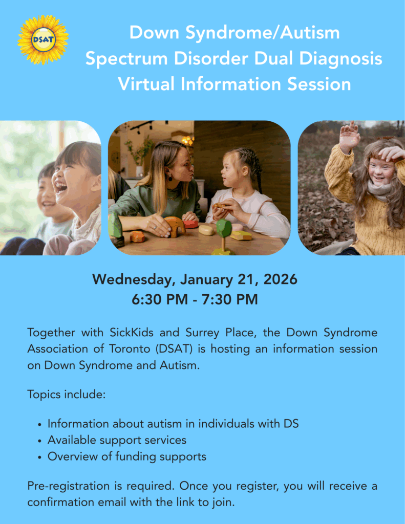 DS/ASD Disorder Dual Diagnosis Virtual Information Session DSAT will be hosting a DS/ASD Disorder Dual Diagnosis Virtual Information Session on Wednesday, January 21, 2026. Register now