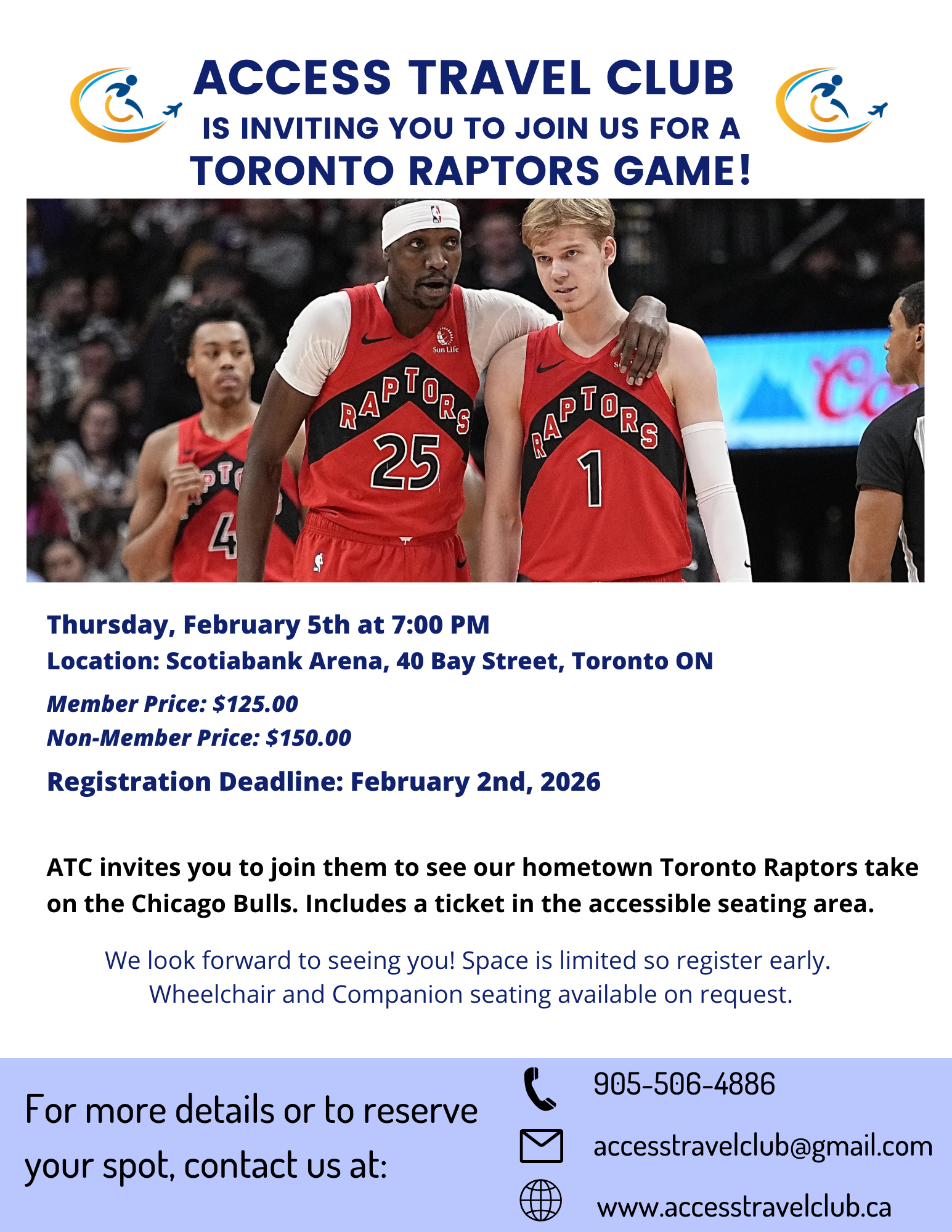 ATC invites you to join them to see our hometown Toronto Raptors take on the Chicago Bulls. Includes a ticket in the accessible seating area.