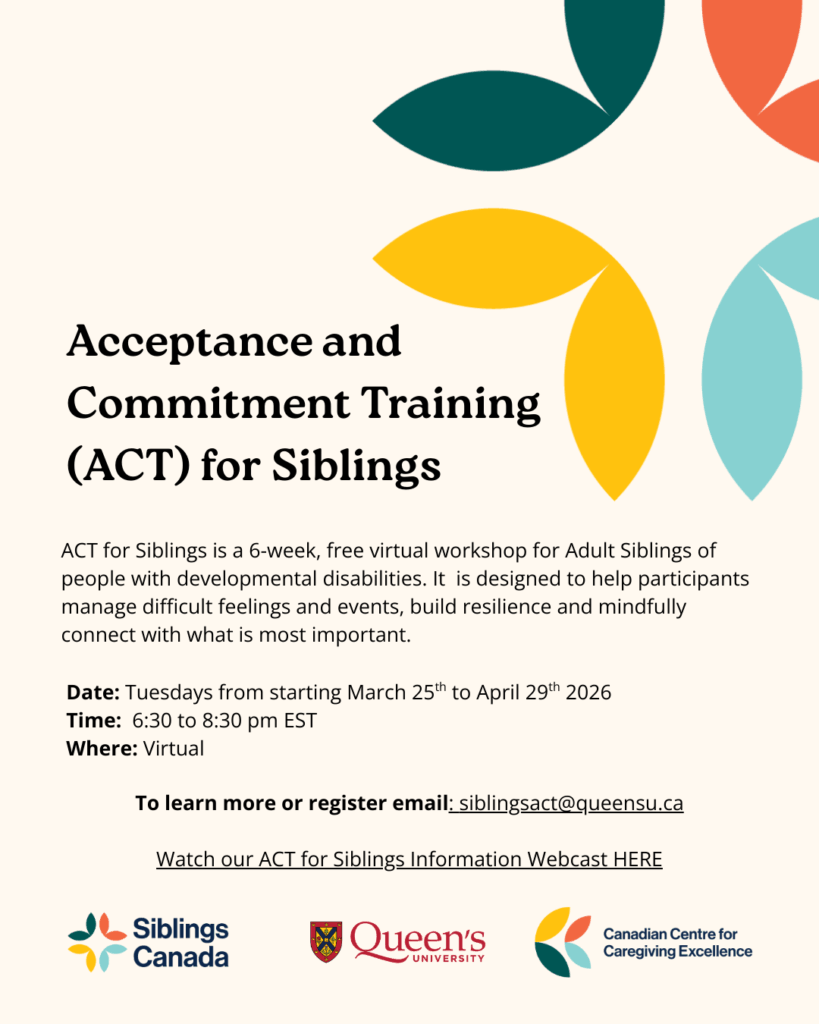 ACT for Siblings is a 6-week, free virtual workshop for Adult Siblings of people with developmental disabilities. It is designed to help participants manage difficult feelings and events, build resilience and mindfully connect with what is most important.
