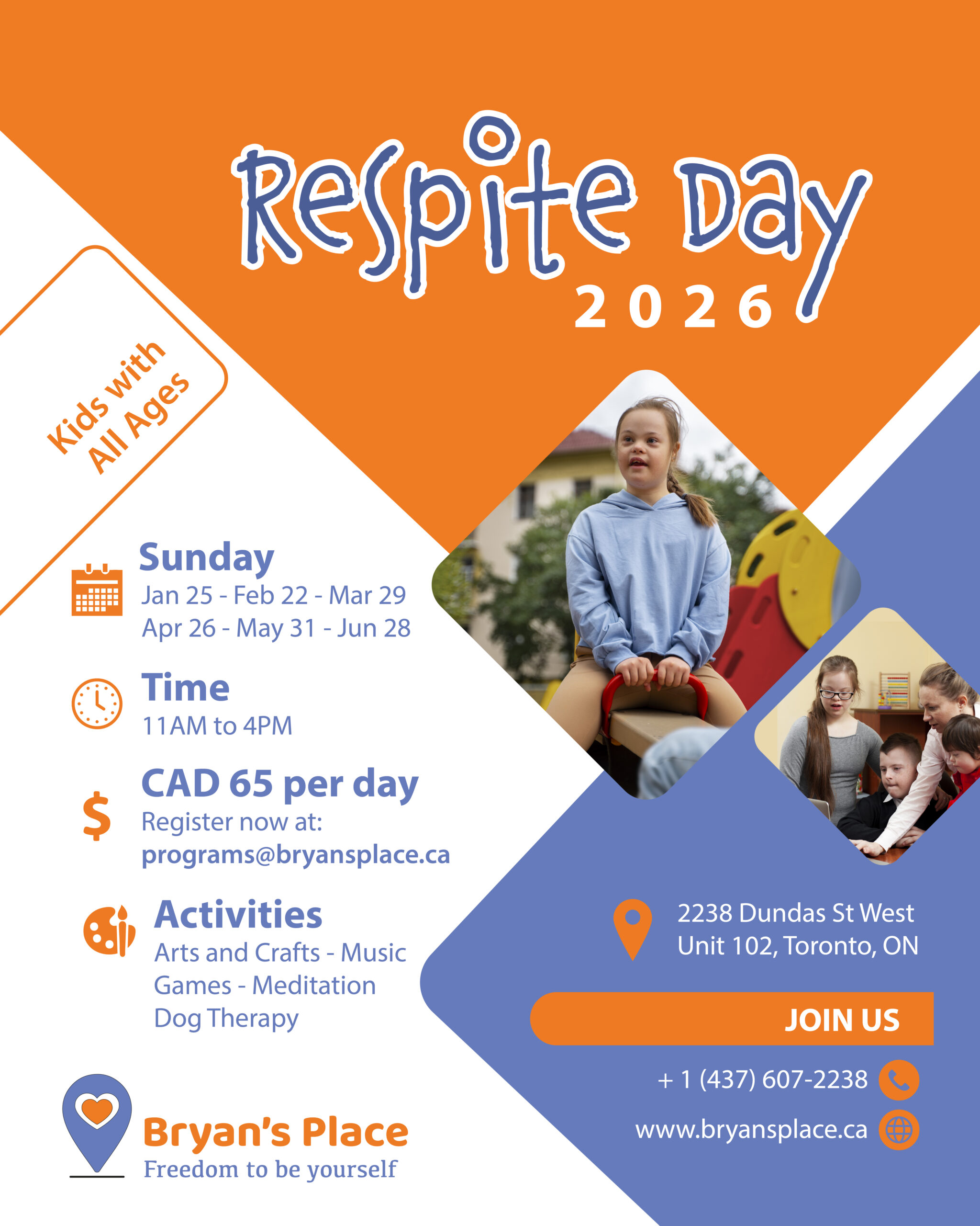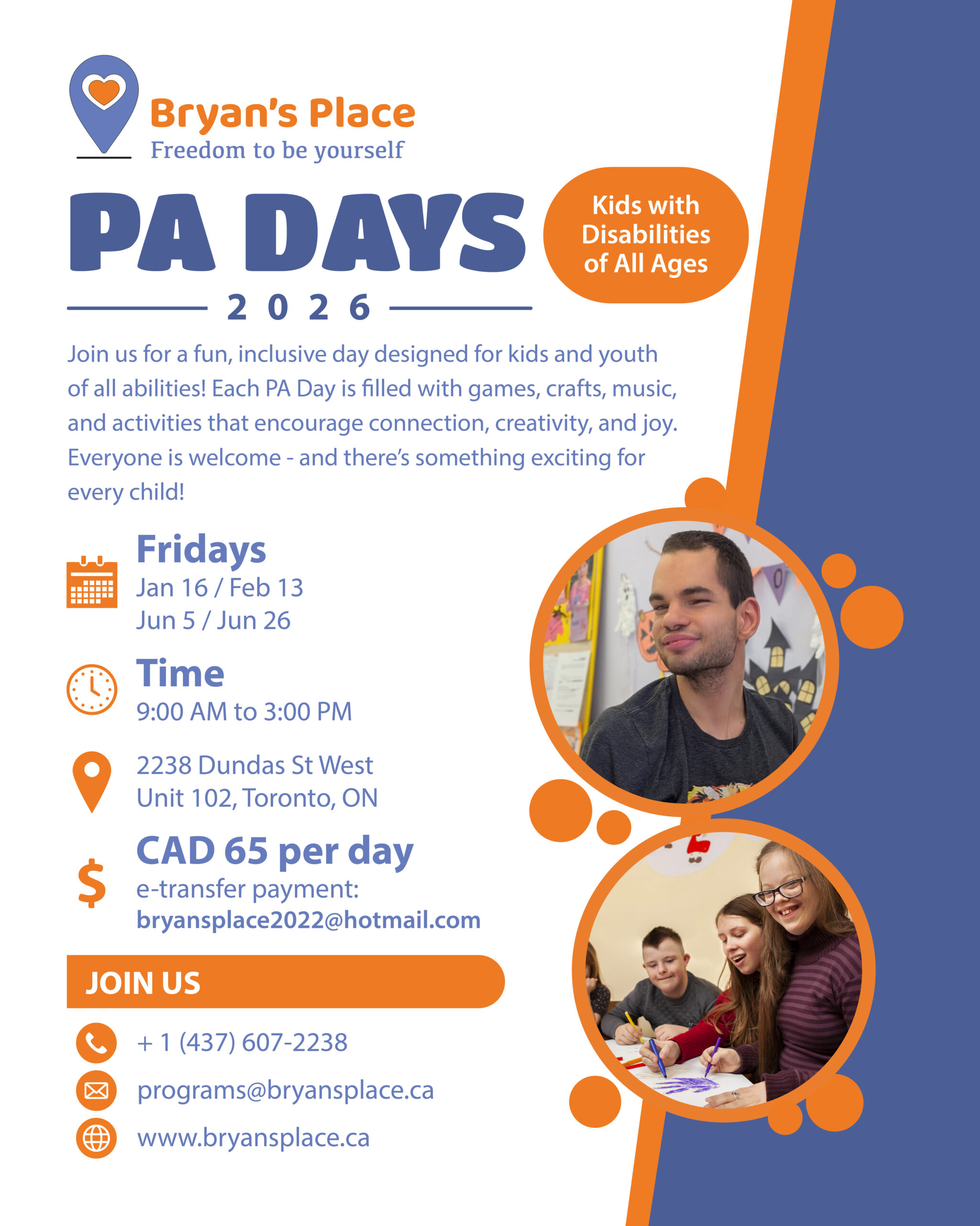 Bryan’s Place offers a fun and inclusive PA Day program for kids and youth of all abilities, with games, crafts, music, and engaging activities in a safe and welcoming environment. – See flyer for more details