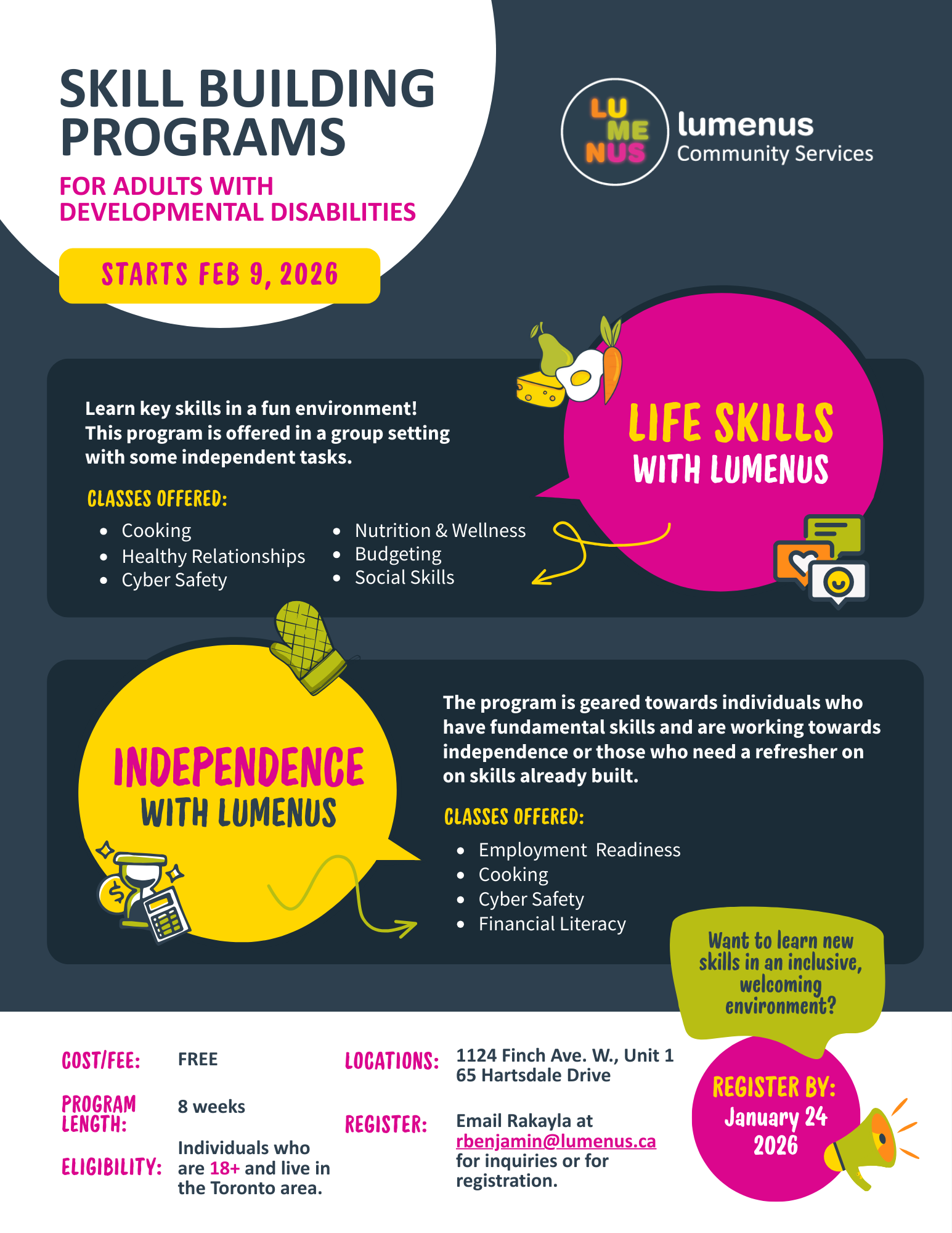 An innovative 1-year program that empowers adults with developmental disabilities by developing employability skills, enhancing communication, fostering independent living skills, and promoting activity and inclusion within the greater community.